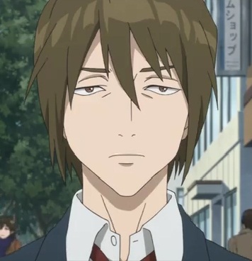 In the anime, he is slightly smaller, with a lankier build. He had brown hair and light brown eyes. He has a pointed fringe, which spikes down in the middle of his forehead. He wears the same school uniform as Shinichi, which consists of a white shirt and a blue blazer, while in the manga he wears a white shirt with black suit pants.